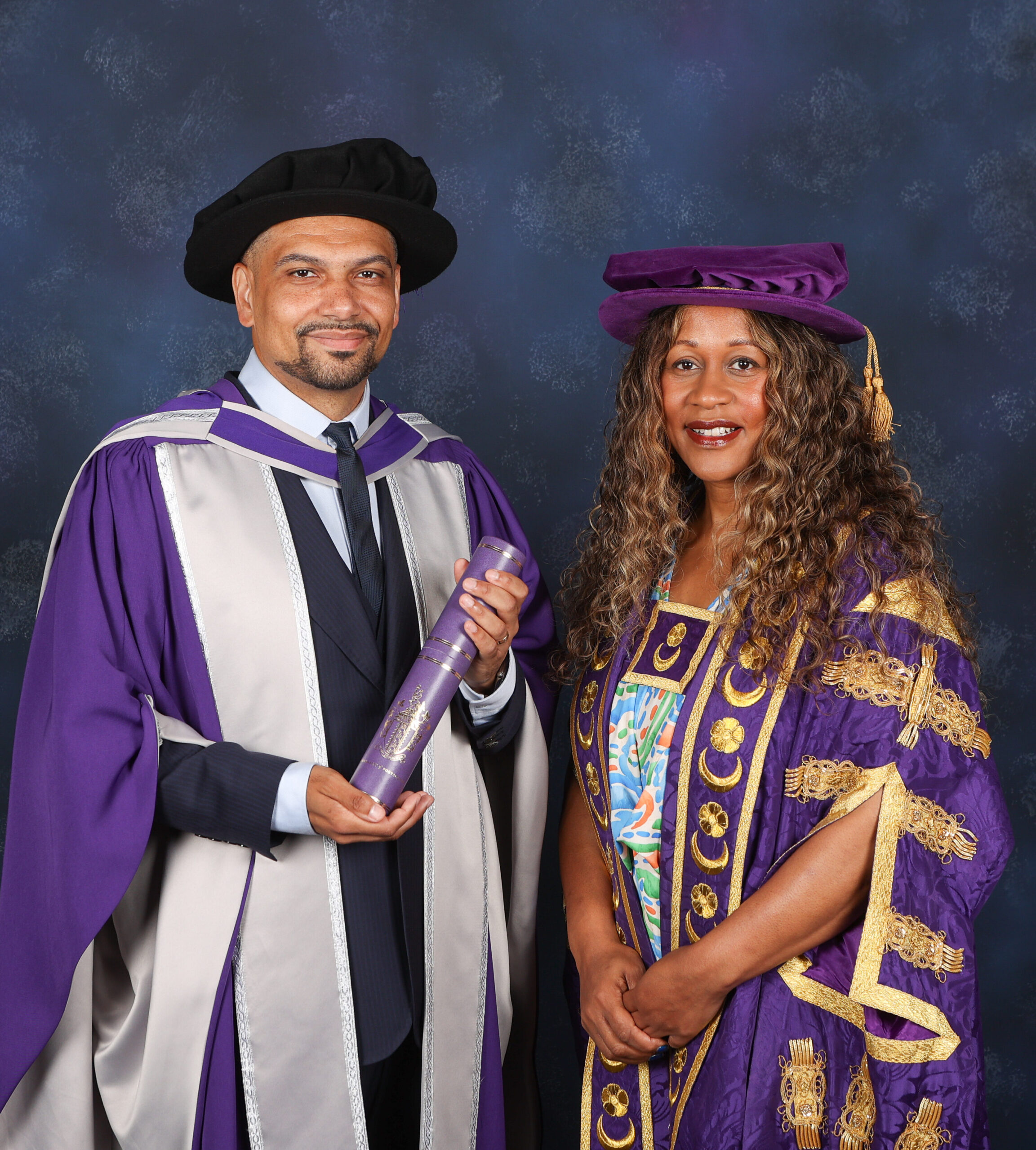 Leon presented with honorary doctorate at Portsmouth University by Chancellor Karen Blackett OBE, for work in sport